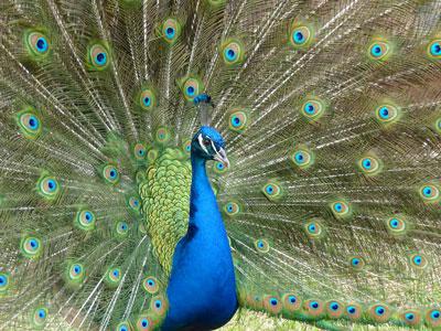 Le mâle a un plumage spectaculaire : la tête le cou et le ventre sont bleu métallique et il porte une traine allant jusqu’à 1,5 mètres, composée de plumes vertes portant un graphisme près de l’extrémité évoquant un œil. Elles sont déployées en roues lorsque le paon parade pour une femelle. La paonne est plus petite est arbore un plumage moins éclatant.