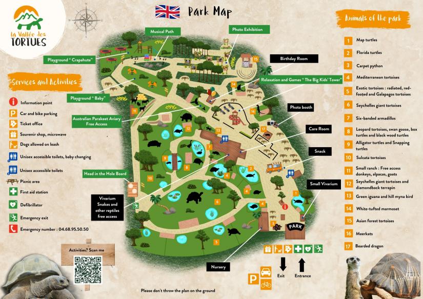 We have baby changing facilities in the toilets and a microwave to heat up baby food for young children. There is no age limit to spend a pleasant moment in the Valley of the Tortoises! Beware of pushchairs: our novelties have been designed to facilitate access to the pushchairs but the surface of the park makes it difficult to access pushchairs with small wheels.